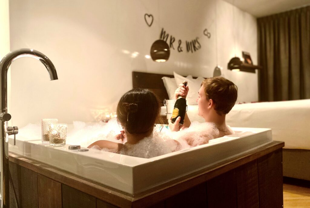 De laatste gasten zijn naar huis en met jullie ceremoniemeester hebben jullie al een afzakkertje op. Hoog tijd dus om een moment voor elkaar te nemen en te relaxen in jullie bruidssuite. En wát voor een bruidssuite. Eentje met twee regendouches een tweepersoonswhirlpool naast jullie luxe pillowtopbed. Neem een duik in jullie bad en schenk nog een glaasje bubbels in. Proost op jullie! Benieuwd naar de bruidssuite? Snappen we. Neem een kijkje in de galerij!